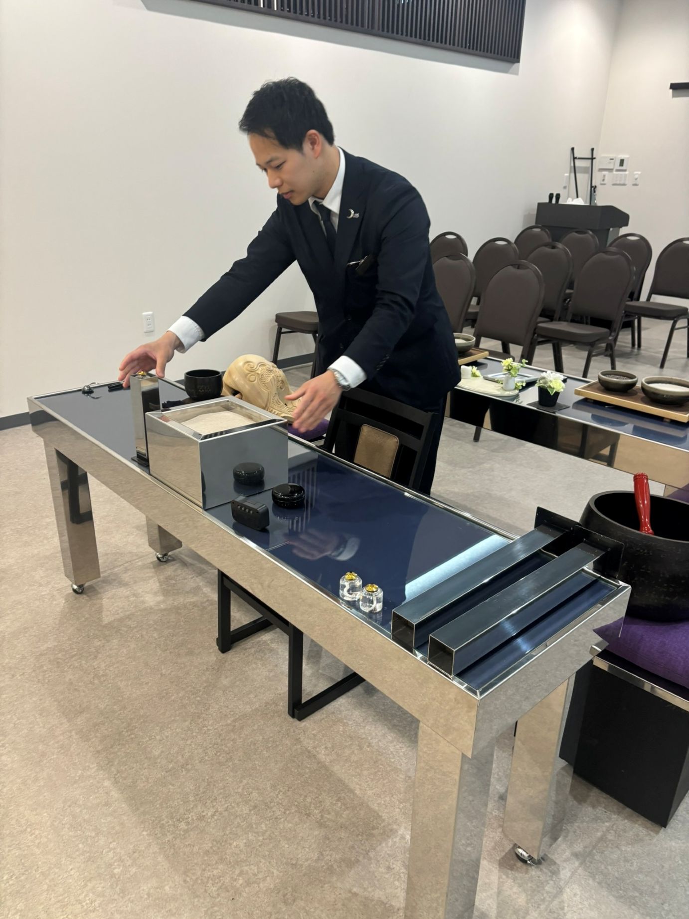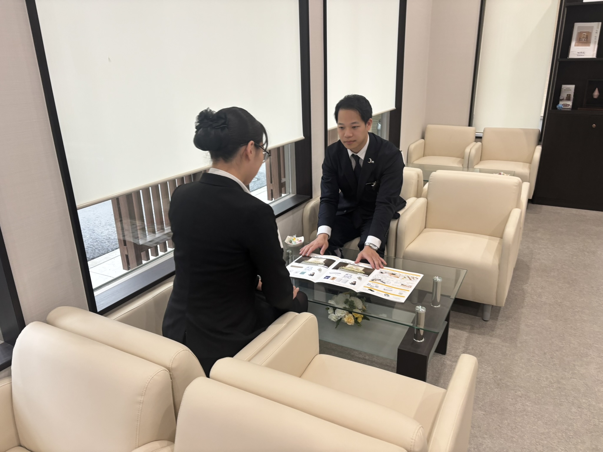 入社後は3ヶ月程度の研修期間をご用意。 OJT研修として「葬儀の流れ」や「作法」「備品の扱い方」等について広く学びます。 先輩スタッフが必ずそばに付き添いますので、疑問点があれば何でも気軽に相談して下さい